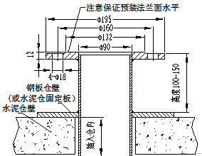 将法兰、铁管及铁板焊接好,注意相互垂直。(见图3)在仓顶适当的位置开孔,孔径为大于钢管外径10-20毫米(注意孔径范围内不能有残余钢筋石块等凸起)。再将铁板放于孔上,用膨胀螺栓或水泥固定于水泥仓顶固定到水泥仓顶上,建议用混凝土将其封住。注意用水平尺找好水平。(指法兰)