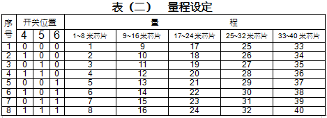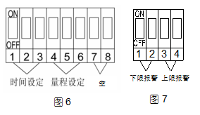 在主机板上有一个8位的DIP开关(见图6),其中左边1、2、3位为自动定时测量的时间设定(见表一),右边4、5、6位为量程设定(见表二), 7、8位为空见表三)。