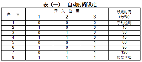 根据DIP开关设定的不同的定时时间,仪表将按一定的时间间隔自动探测。在这种状态下,也可进行手动探测。当DIP开关的第1、2、3位为000时,为手动状态,自动探测无效。为111时,进入换钢丝绳程序,此时无探测功能,维修人员可上仓顶换钢丝绳。