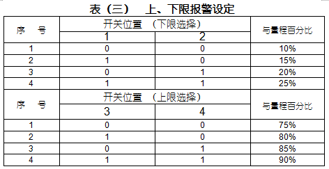 在主机板上有一块立板,上面有一个4位的DIP开关(见图7),其中左边1、2为下报警设定,右边3,4上限报警设定(见表三)。